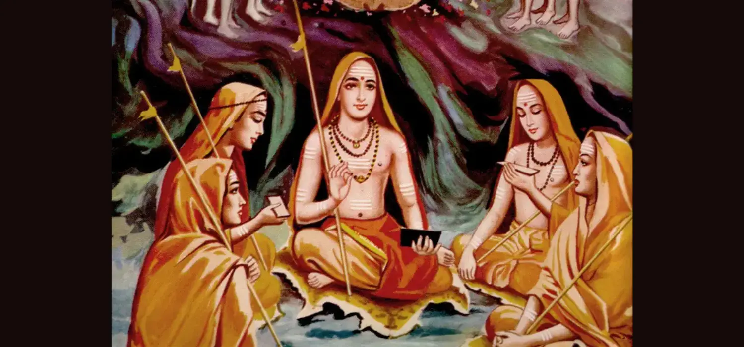 Fortunately, Shankara’s thirty days was just about to expire, and he managed, by a reversal of his yogic power of kaya pravesh, to make it back into his own body as the soldiers began to cremate it. As the flames were about to rise, Adi Shankara jumped out of the funeral pyre, sustaining only a burn on his right hand, and thus saving his own body. When Shankara and his disciples retuned to Madana Mishra’s place, Bharati conceded defeat before a word was uttered. She had already read the outcome in the stars. Madana Mishra gave away all his wealth to the poor and became a sannyasi, the disciple of Adi Shankara.