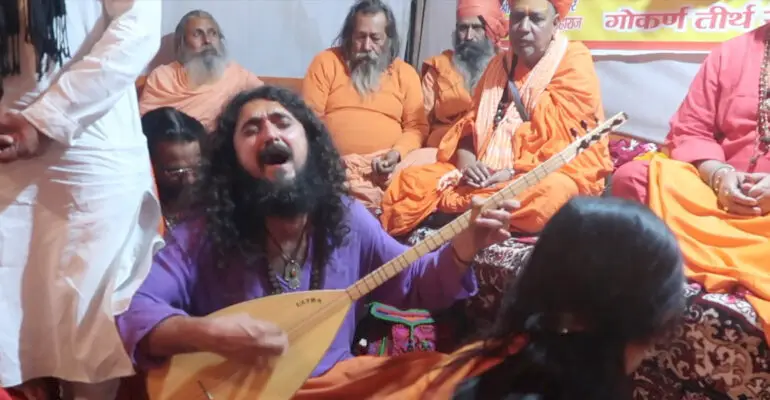 Bhajans in the tent of Kamal Puri, featuring Suryademah singing Persian songs of Multani Baba, playing the baglama.