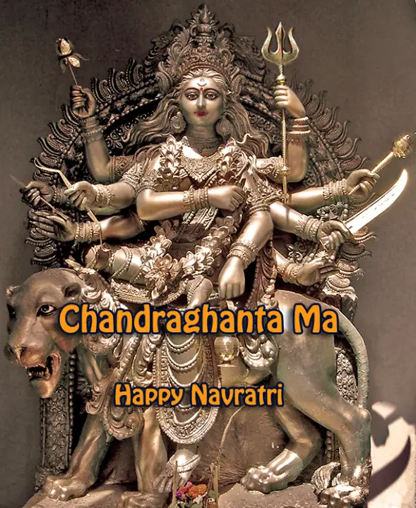 On Navratri Day Four, Friday, October 16, 2015, the third day of the Moon, we worship Chandraghanta Ma, who is also Parvati, but AFTER her marriage to Shiva, and this is marked by Shiva’s 5 day crescent moon she now wears on her forehead.