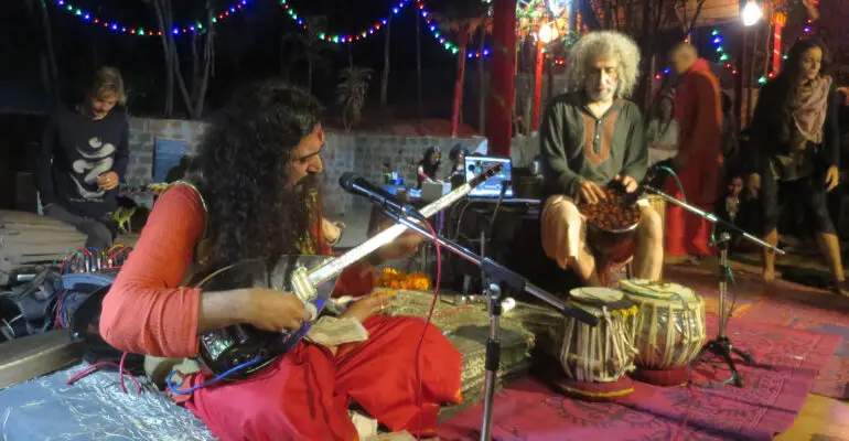 Dervish Baba Suryademah plays the baglama and sings, accompanied by Emam on tabla, at the dhuni of Baba Rampuri in Assagao, Goa, on the auspicious occasion of Mahashivaratri 2018.